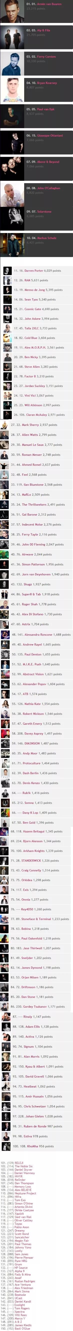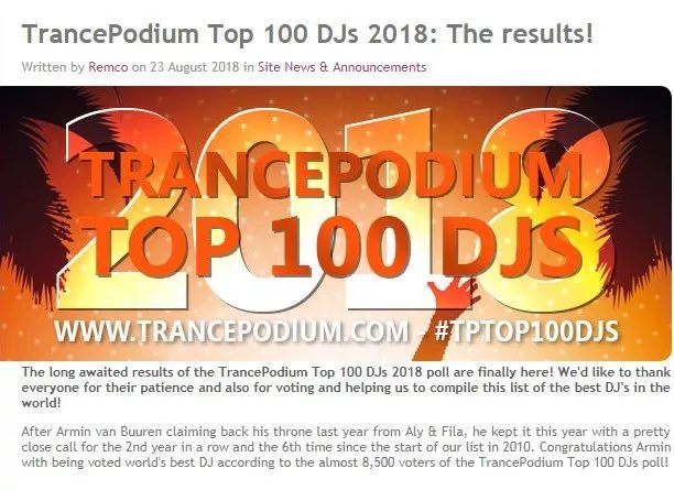 TrancePodium Top 100 DJs开启于2010年,至2018年一共举办八次。其中,Armin van Buuren取得了六次冠军。而曾经夺冠的Aly & Fila则在今年排名第二。尽管这名义上是一张属于Trance艺人的百大DJ榜单,但举办方TrancePodium还公布了101~150的成绩。