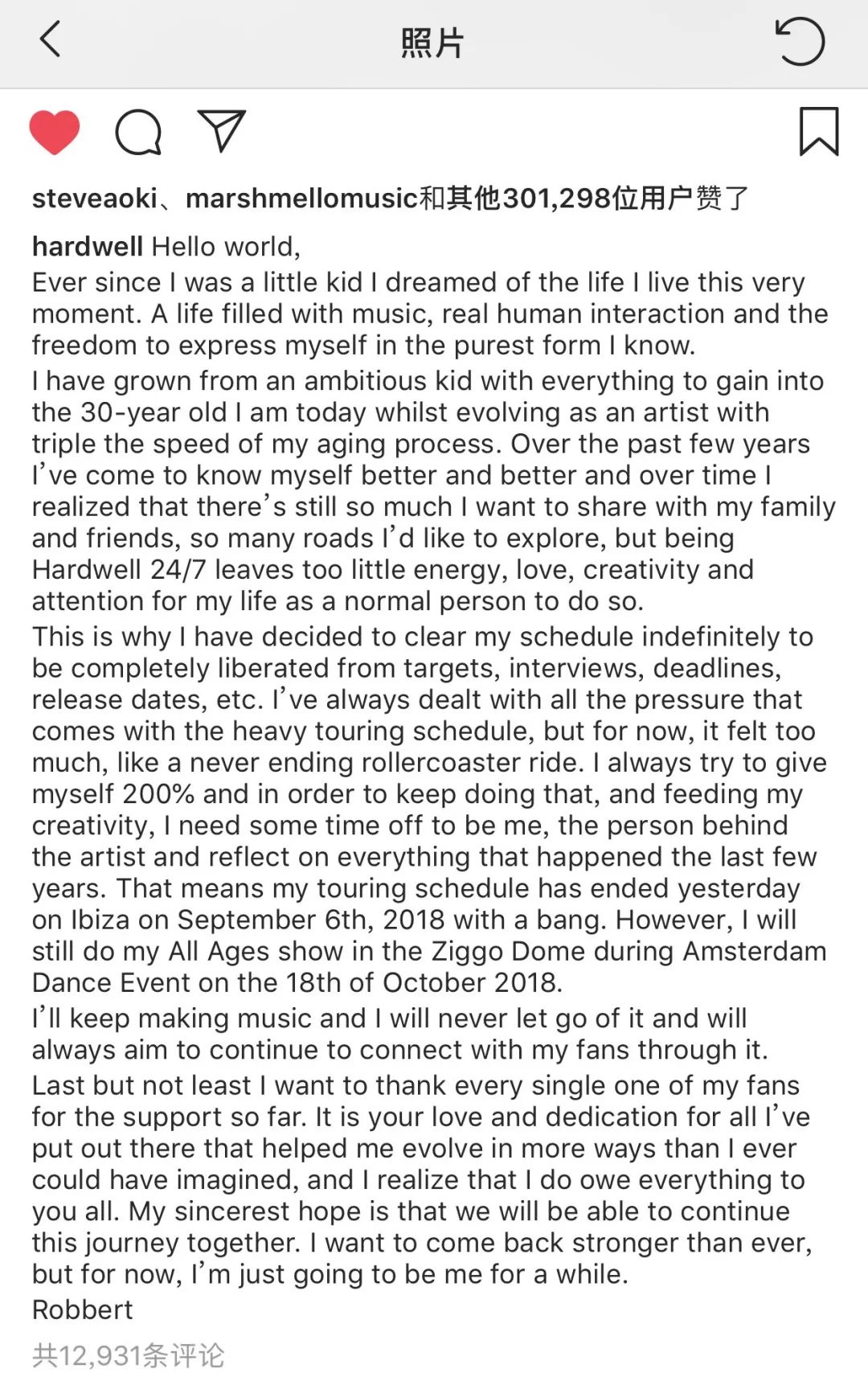 至于退出舞台的时间会是多久,只有Hardwell清楚。也许他只是“心累”了想休息一下,旅游一趟就回归了。也有可能他早就想好了下一家项目,花几年的时间投入一些工作量不那么大并且不那么伤身的工作也有可能。不要想得太糟糕了,好歹一切都还未结束。