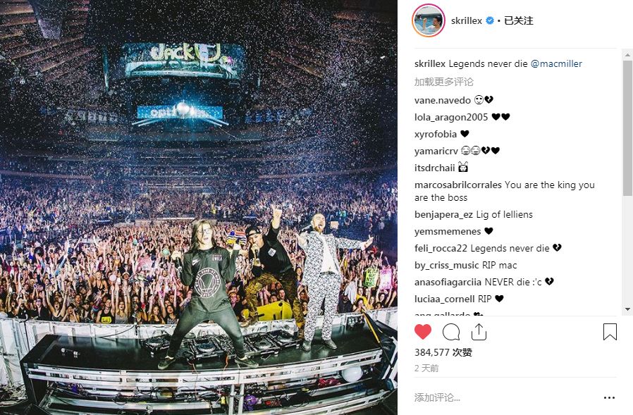 曾经的Brostep或者说Heavy Dubstep代表人物之一Skrillex也在两天前发布了一则动态,配文“Legends never die @macmiller”。Mac Miller曾经在Jack U的演出上客串并带来精彩的说唱人声,也是Skrillex的好朋友,一句简单的话语不知蕴藏着多少其它情绪。