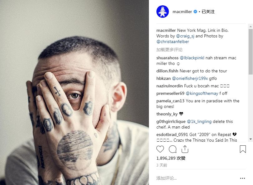 阅读原文抱歉,这篇文章来晚了!就在美国时间2018年9月7日,线上粉丝上千万的超人气Rapper Mac Miller惋惜地离开了世界。经多家西方国家主流媒体报道,这名26岁的Hip-Hop界明星Mac Miller于周五在洛杉矶家中去世,死原为XX过量。词汇敏感不便指出。