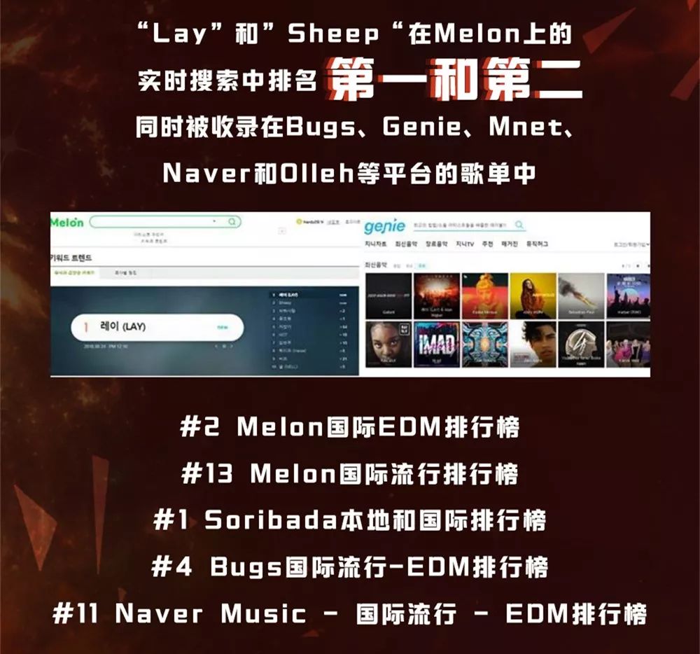 韩国的几大主流音乐流媒体分别为Melon/Bugs/Genie/Mnet/Naver/Olleh,而《Lay - Sheep (Alan Walker Relift)》在韩国的人气同样是意想不到之高。在韩国几乎所有流媒体登榜,从第一名至十三名,又一次证明了张艺兴与Alan Walker的粉丝分布国家之广。张艺兴的大名更是登上了海外社交媒体热搜榜,彰显了其国际影响力。