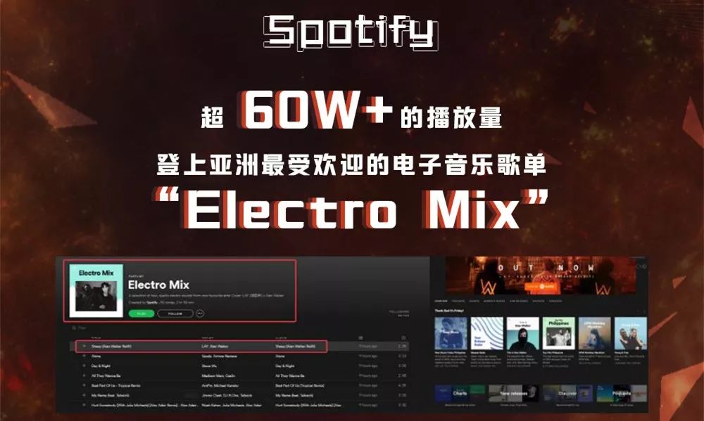 在全球最具影响力的音乐流媒体之一Spotify上,《Lay - Sheep (Alan Walker Relift)》更是被Spotify家喻户晓的电子音乐歌单“Electro Mix”收录,并已获得60万以上的播放量。如果你是一名Spotify用户,更是有机会看到这首音乐在多个窗位展示。