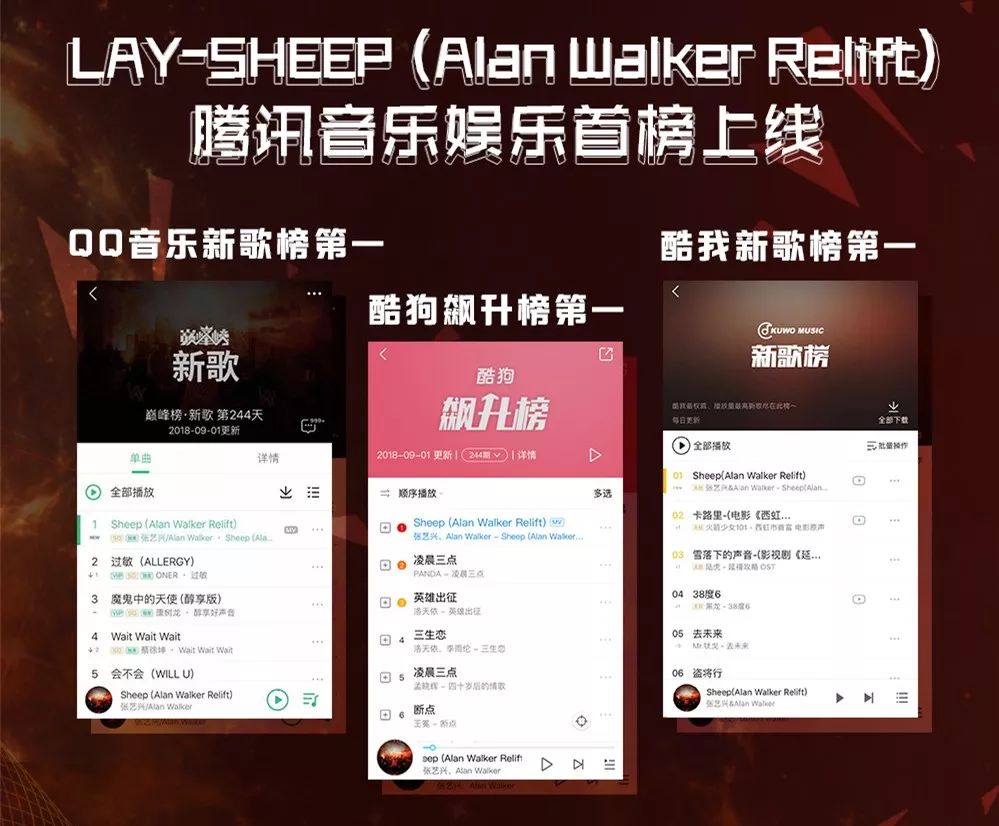 《Lay - Sheep (Alan Walker Relift)》以掩耳不及之速在全世界引发巨大的轰动,更是在44个国家和地区疯狂屠榜。其中包含了众多国内外的主流音乐榜单,其数据再一次证明了张艺兴与Alan Walker的全球影响力不容小觑。平心而论这首音乐的质量也比较高。