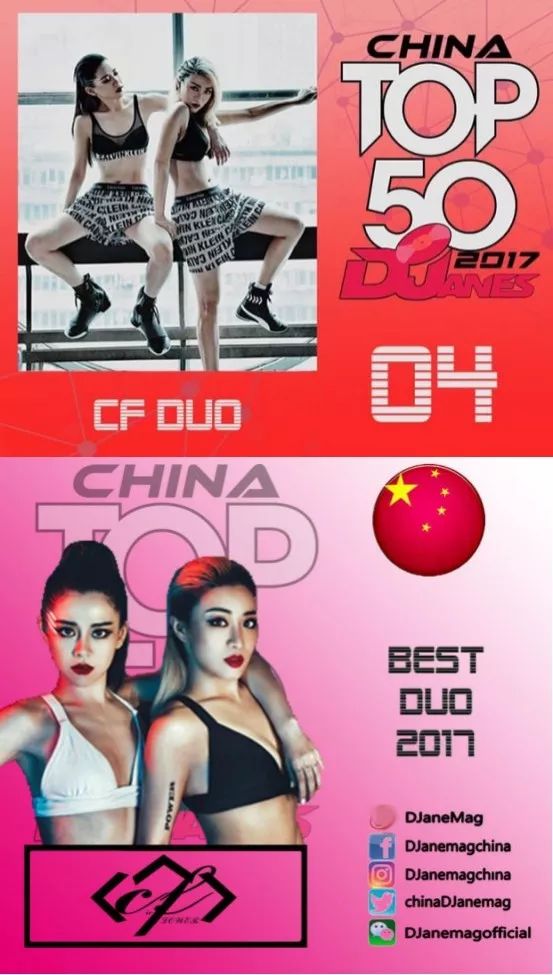 CF DJs是去年到今年非常活跃的中国女DJ双人组之一,甚至有可能是曝光率最高的本土女DJ双人组。他们在全球知名榜单取得了中国女DJ排名第四、中国女DJ组合第一的优异成绩。现如今签约于RYHU的她们正在努力地于“PYRO中国百大DJ排行榜”拉票。