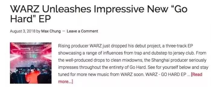 曾经活跃于北美的Warz当然也希望自己成为一名国际化的艺人,他也曾在多伦多为Ookay和Grandtheft暖场。幸运的是,Warz在前段时间发布的最新EP《GO HARD》除了在现场被广泛传播和播放以外,也在全球最具影响力的Trap媒体《Run The Trap》上被发文报道,因此得到外国听众的关注。点击“阅读原文”进入《GO HARD》EP。