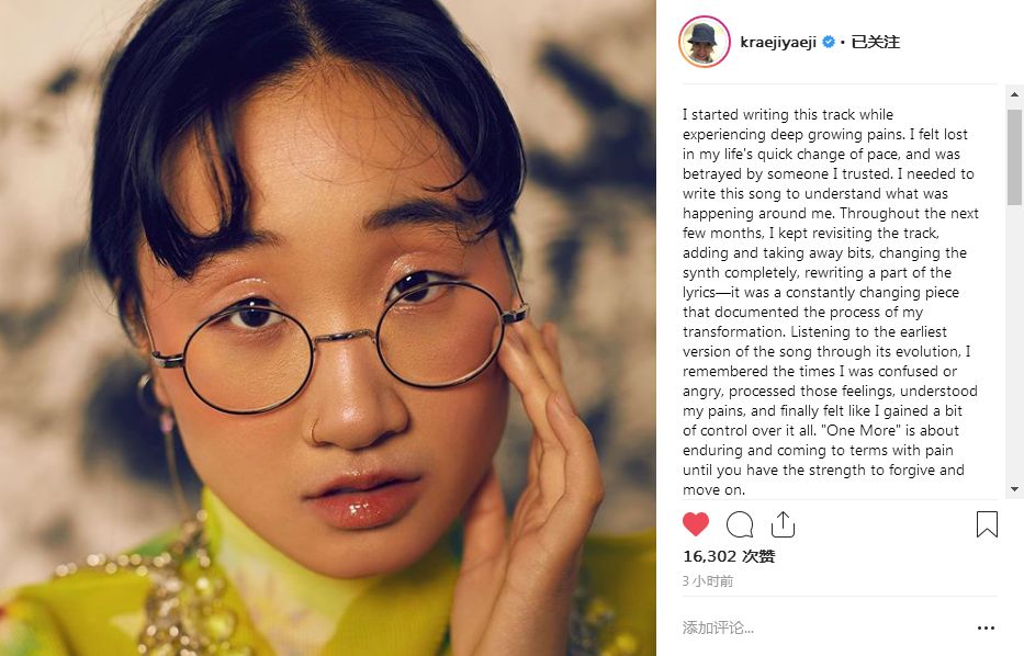 就在今天凌晨左右,Yaeji为新老粉丝们带来了一则新闻!Yaeji发布了她的最新单曲《One More》,这首曲目讲述了她真实的故事,在成长中经历过的深刻的痛苦。她在快节奏的生活中感到迷茫,并且被十分信任的人背叛了,音乐是她解决这一切的方式。