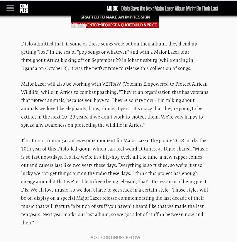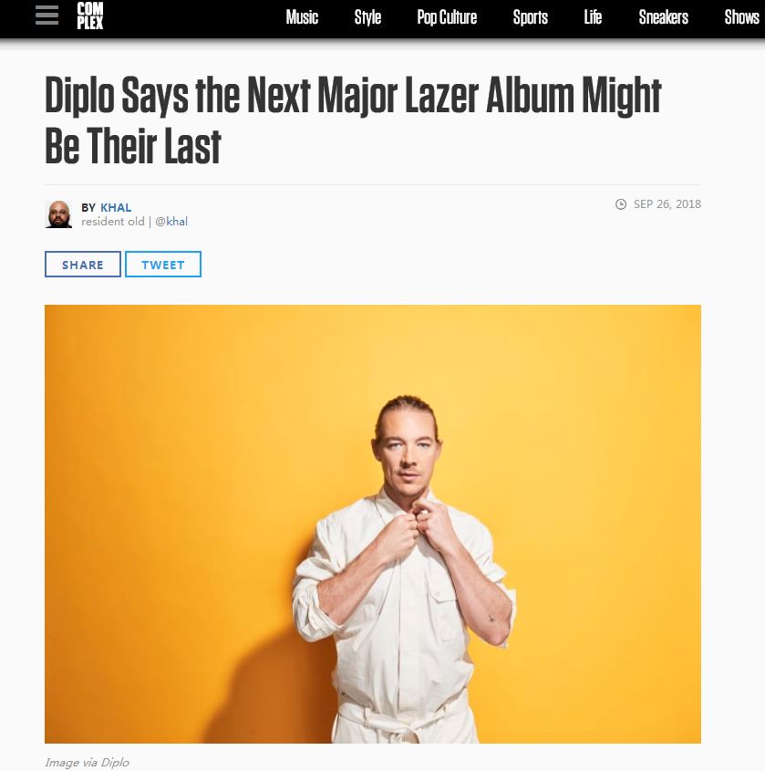 截止到目前,Diplo和Major Lazer的官方账号都没有公开他们将在2019年解散的消息,只是通过Complex这样影响力巨大的媒体帮他们散播这件事。2019年的专辑会是他们的最后一步,而这几个月的时间里,他们将会为“最后一张专辑”付出一些什么呢?