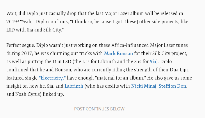 而当Complex问道Diplo为什么的时候,Diplo也解释了原因。“我现在有其它项目要忙,比如LSD和Silk City”。作为公认的组合狂魔,你也知道,Diplo今天把大量的时间投入到他的新组合LSD与Silk City中,也找了很多音乐媒体推广了这两个新的组合。