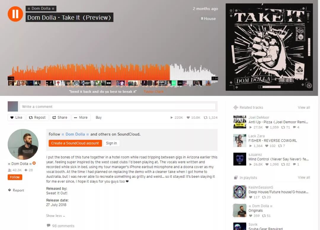 视频中的曲目名是《Dom Dolla - Take It》,Dom Dolla本人只把它归类为House,但一些媒体以及音乐流媒体也更明细地把它划分到Tech House或者Deep House当中。可能从Drums/Bass/Sub-Bass来看都有一点吧。如此强大的律动,也难怪老奶奶爱它!