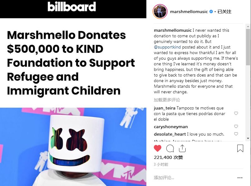 过了六天之久,Marshmello终于在它的社交媒体Instagram账号上做出了回应,所以我们也选择了在今天发布这篇文章。非直译的大致意思是,“我不希望这种捐款被公布出来,但是KIND公布了这件事。我只是在报答粉丝的支持,把金钱回馈给别人”。简单来说,发财了做些公益。