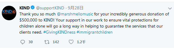2018年9月28日,美国移民儿童、难民儿童保护组织Kids in Need of Defense亦称KIND,在官方推特上宣布,“感谢Marshmello捐款50万美金给KIND,你的支持将确保我们为保护孤独的儿童起到至关重要的作用”。此处非直译,只转述大致的文内意思。