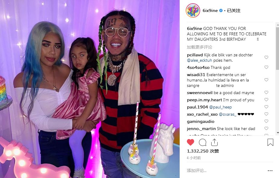 因为我们以前并没有介绍过6ix9ine,所以这篇文章的人物铺垫有点长。然而就在昨天,6ix9ine在Instagram等社交媒体上宣布,他的女儿已经三岁了,而且6ix9ine也陪伴他的女儿度过了她的三岁生日。大量网友表示不可思议,69竟然已经是个爸爸了?