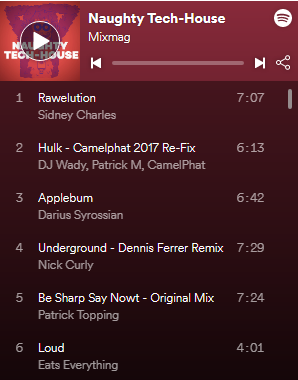 因为这场浪潮,刚才提到的Mixmag又专门为Naughty Tech House建立了一张歌单,当你在Google搜索Naughty Tech House的时候很容易找到这张热单。这其中的Naughty Tech House作品也听起来更有代表性,很适合用来入坑,我们听听看,感受一下。