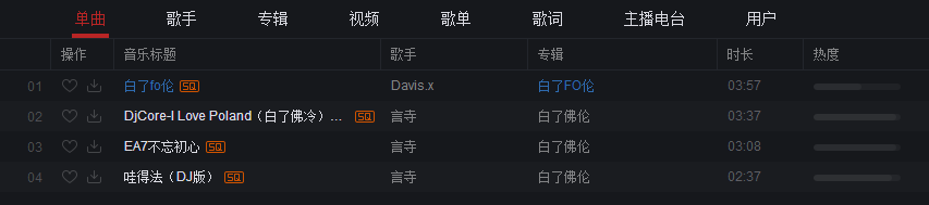 那么说完了它巨大的土嗨受众,还需要聊聊这首音乐所出现的盗曲现象。在各个中国的音乐流媒体中,只要你搜索“白了fo伦”,都会发现各路“不知名制作人”,把这首歌挂在了自己名下。“白了fo伦”是个热搜关键词,将它改个名字,流量也就不请自来了。
