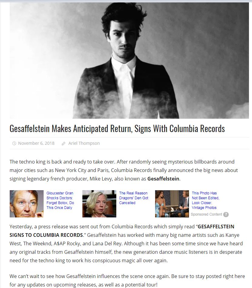 这并不是最新的大新闻,如果说即将回归只是通过一张图片进行线上和线下的铺垫,那么今天这篇文章应该就可以算得上实锤了。三大Major Label之一的索尼音乐旗下的Columbia Records,在三天前宣布,Gesaffelstein现已签约Columbia Records!