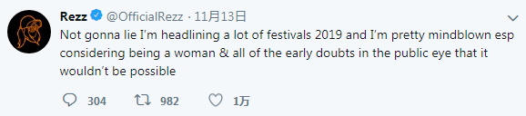 也有“性别歧视者”提出:“顶级音乐节不会让女性成为他们的Headliner”,所以Rezz的大概意思,也就是否认了那些“女性不能成为各大音乐节的Headliner”的说法。她用自己的行动告诉大家,女性确实也可以成为Headliner,间接“打脸”部分人的偏见。