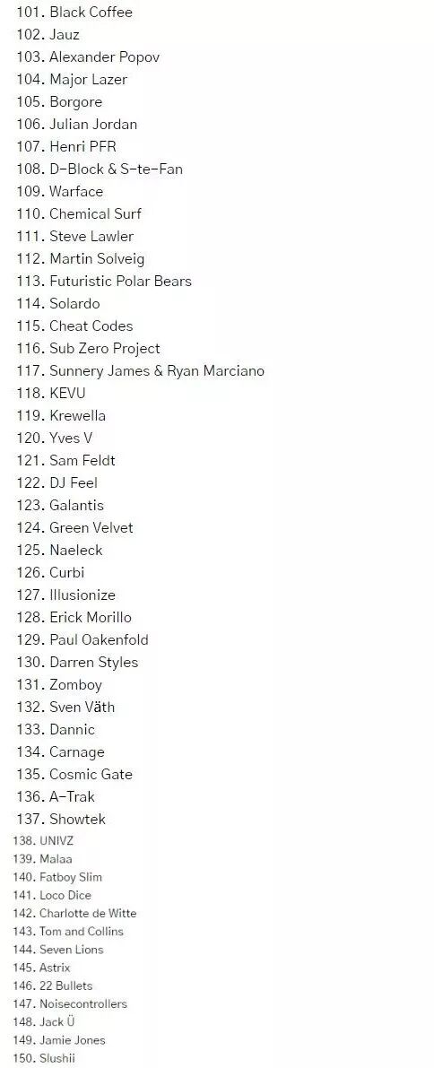 有趣的是,101~150通常是不会用来交易的,因为没有人会想着去购买一个榜外的成绩,这也因此而界定了101~150名某种程度上才是真正的投票结果证明。连DJ Mag官方也在发文中说到,“101~150名次体现了更多种跳舞音乐的子类型以及跳舞音乐的广度”。