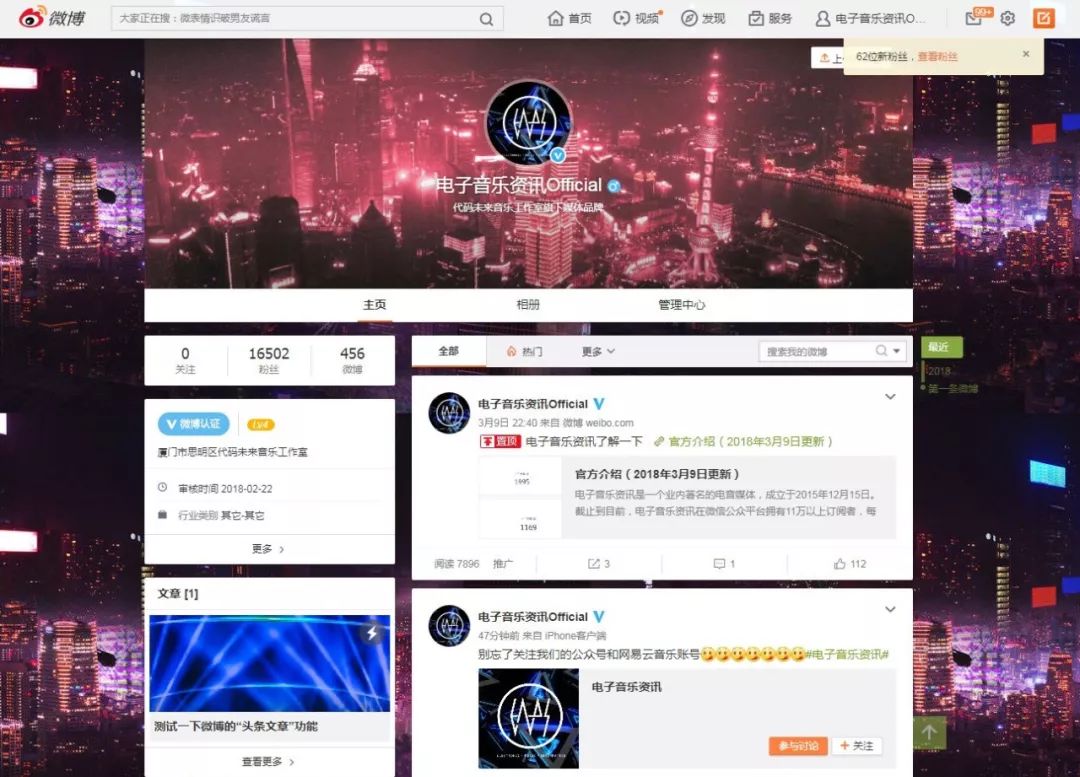 当然,如果你经常使用微博,且支持《电子音乐资讯》的多平台发展,也可以在微博上关注一下“电子音乐资讯Official”。带有蓝V的是我们的官方账号,记住在“电子音乐资讯”后面跟着“Official”的后缀。未来,微博可能会设定不一样的内容,尽请期待。