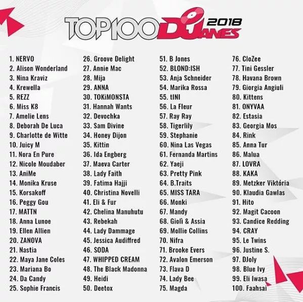 而就在撰写本篇文章的三小时以前,DJane Mag也在社交网络上宣布了今年的百大女DJ整体成绩。我们所熟悉的“Techno女王”Nina Kraviz位居第三,Amelie Lens位居第七……还有大众热爱的Alison Wonderland/Rezz/NERVO等人也全部获得了前十的好成绩。