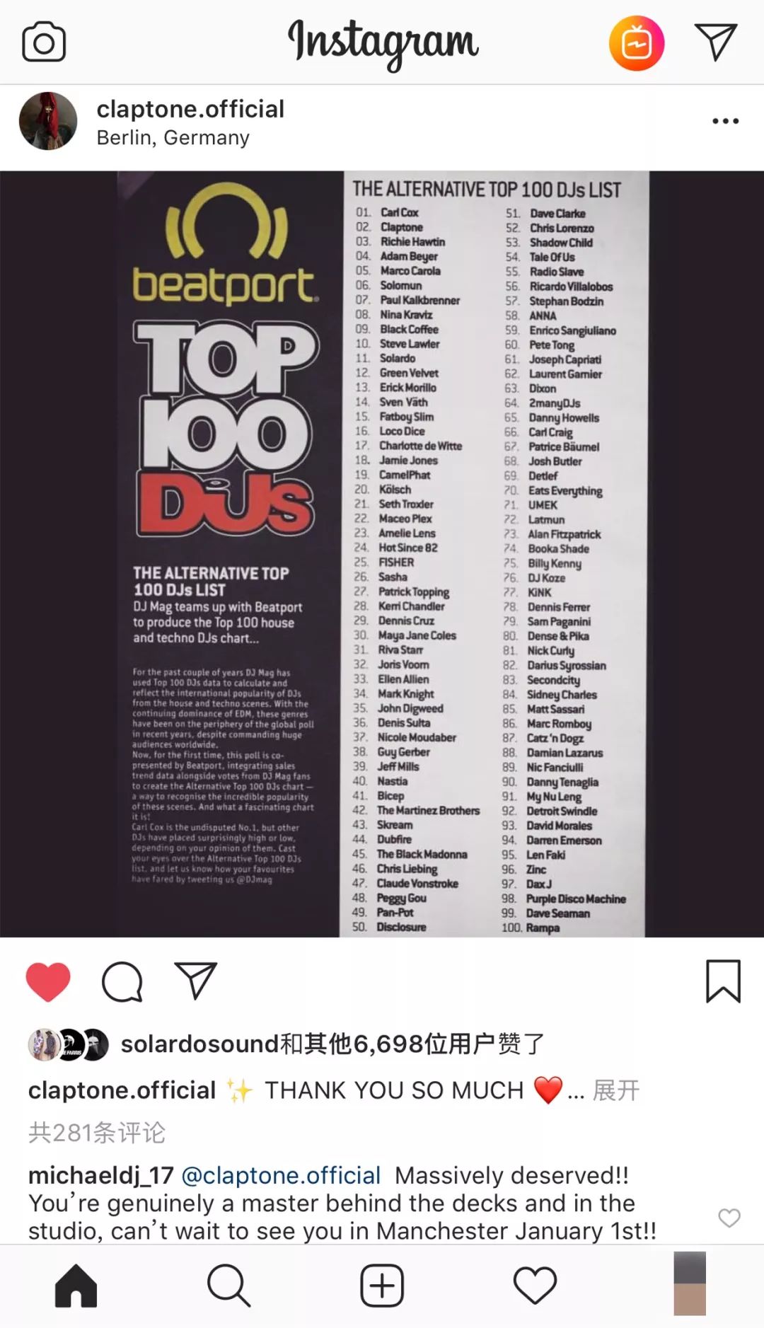 在排名公布以后,众多House/Techno粉丝表现支持,甚至对DJ Mag刮目相看。不过很多人也认为这是Beatport的功劳,带上DJ Mag更像是因为他们在百大艺人榜单这一方面的影响力。很多House/Techno艺人也发布了动态,表示很高兴自己上了榜且在乎此事。