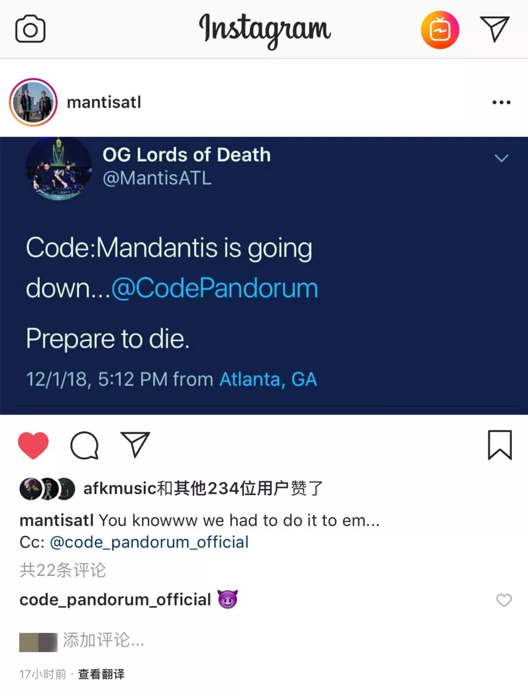 而就在一天前,Mantis和Code:Pandorum双双在推特等社交媒体上宣布了一则消息,他们正在合作一首新的音乐,并将这首音乐的氛围描绘为“Prepare to die”。所以,人们认为这首新音乐很可能会是富有杀气的Orchestral Deathstep或者Deathstep。