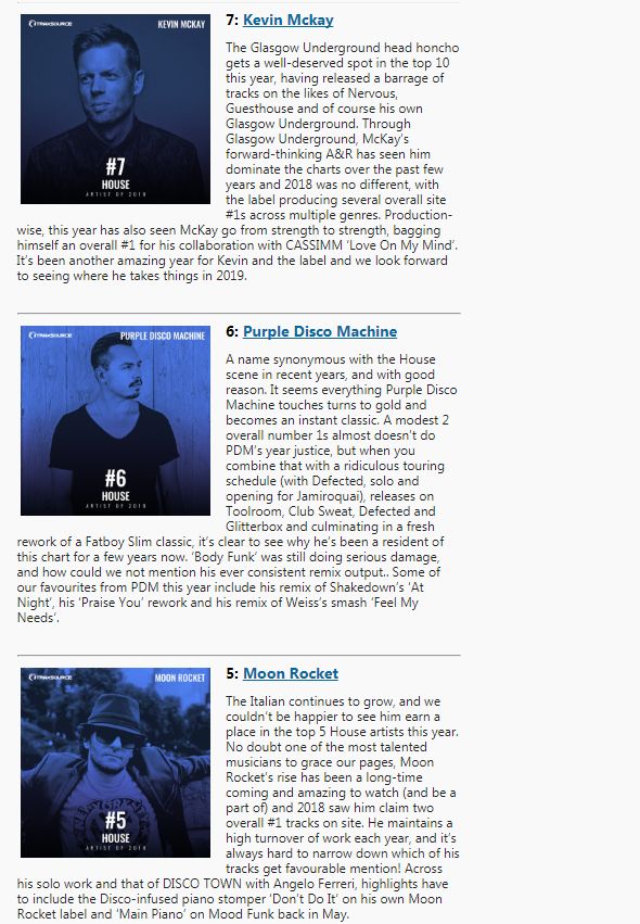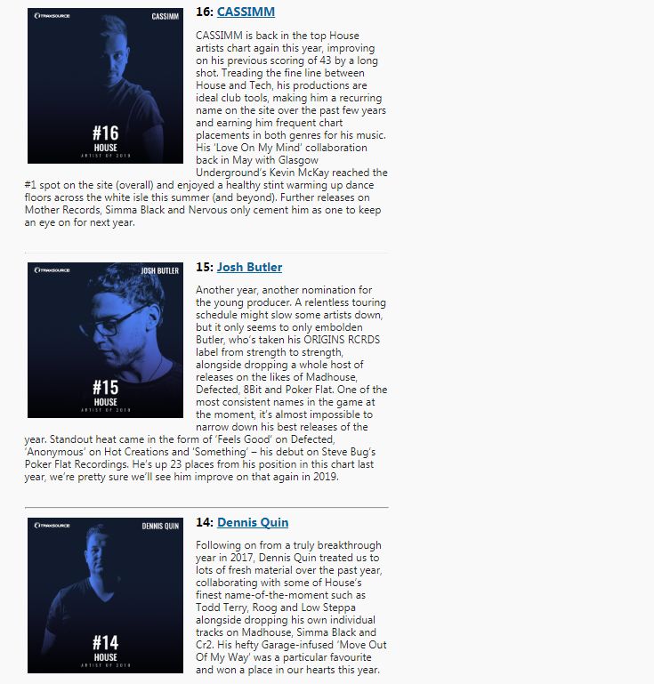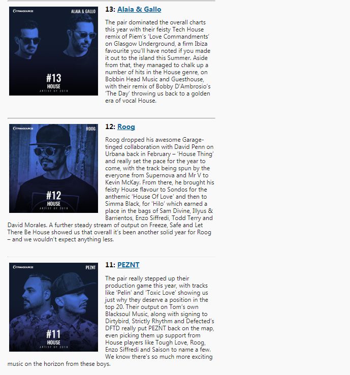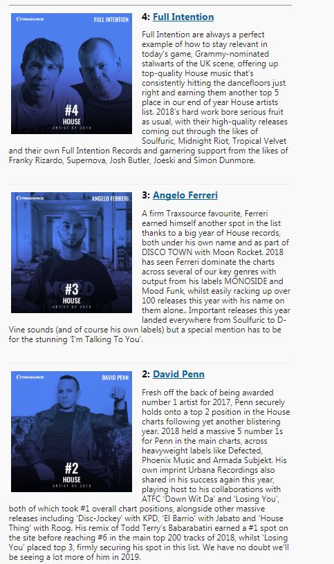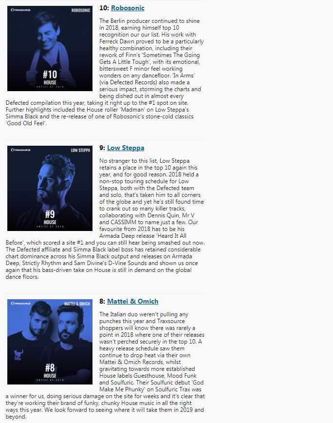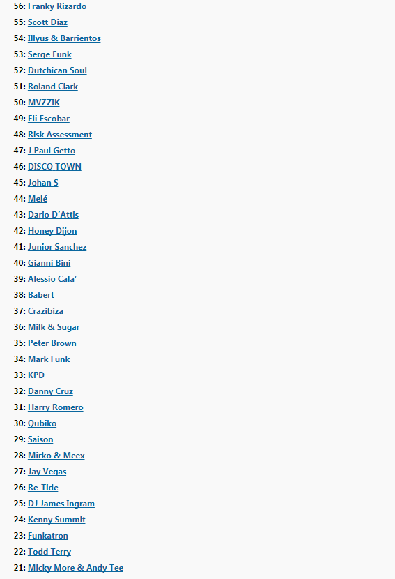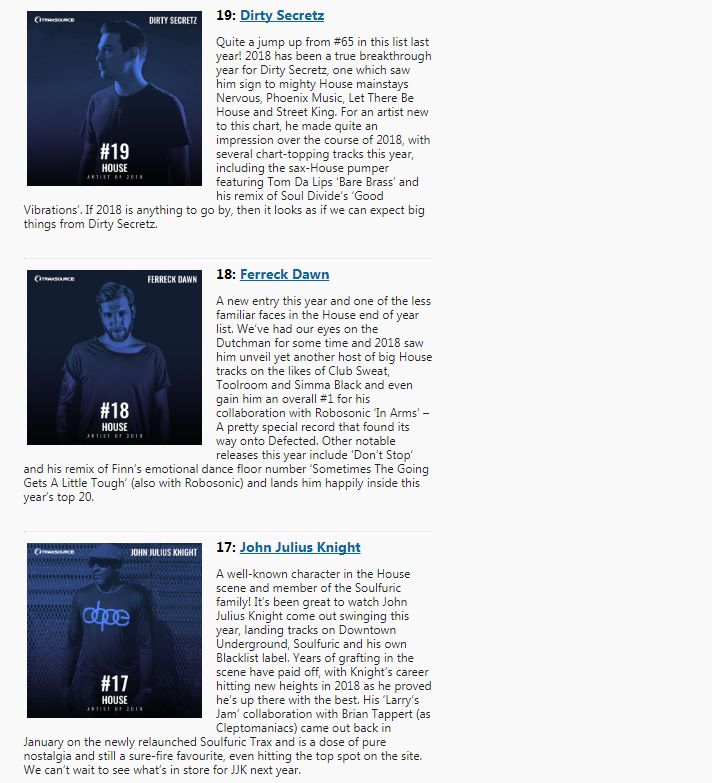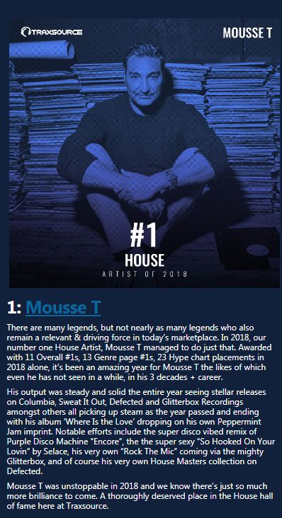 两天前,Traxsource在他们的官网新闻页面以及Facebook/Instagram等媒体上宣布了2018年的百大House DJ排行榜结果。关于榜单内Top 20的House艺人,Traxsource在新闻页面给出了人物介绍。而21到100名则直接以纯排名罗列,一起看看本次的结果吧。