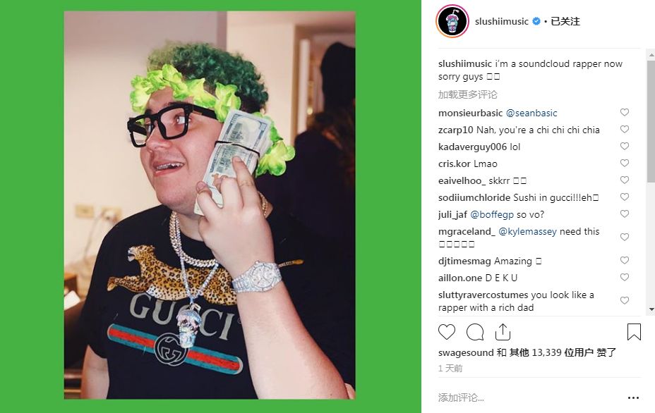 不过,像这样的玩笑,认真你可就输了。你可以理解为Slushii在讽刺,但你也可以反过来理解为Slushii在进行着角色扮演,这就是篇趣味文章,仅此而已。像Lil Pump等等Rapper一天到晚都是这样的穿着。成为Soundcloud Rapper甚至不需要音乐证明,有时候形象可以代表风格。