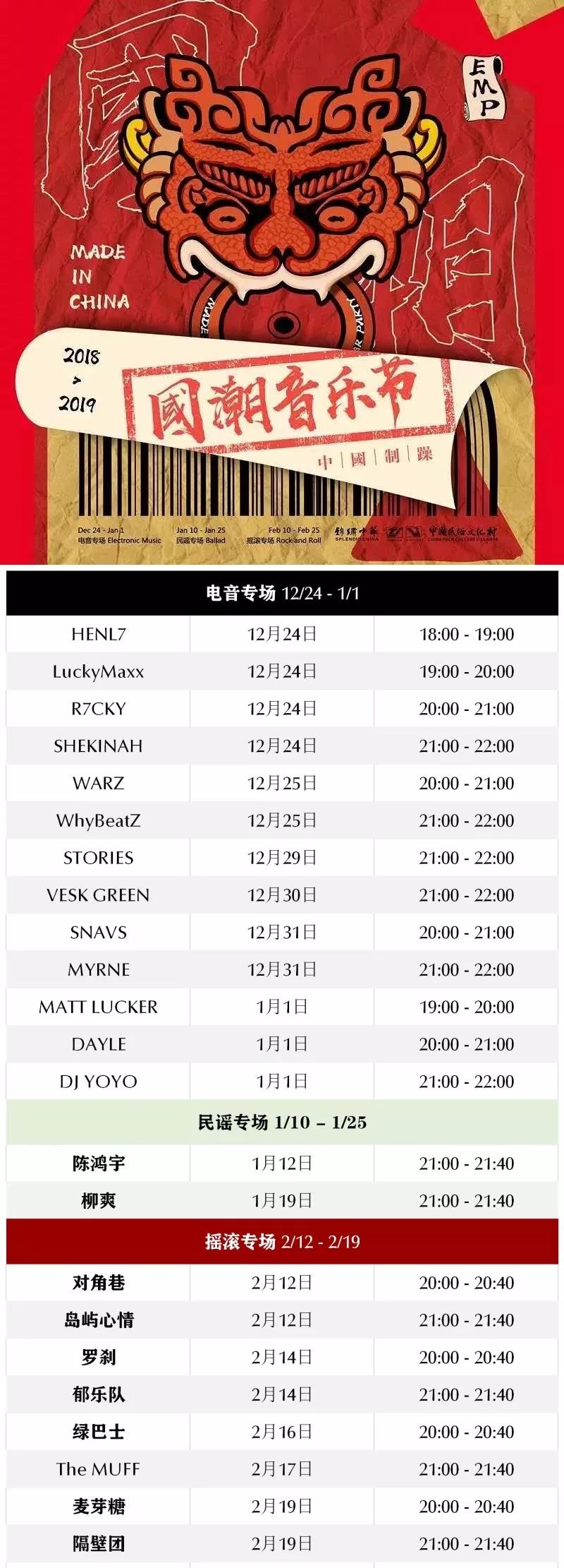 2018年12月24日开始,2019年2月19日结束,音乐节总共涉及了其中13日。除了两位国际知名艺人以外,还邀请了YOYO/DAYLE/MATT LUCKER/SIMON Y等中国电子音乐艺人轮番上阵,同时设有民谣、摇滚活动环节,名副其实超低票价+超长周期。13日分布情况见下图。