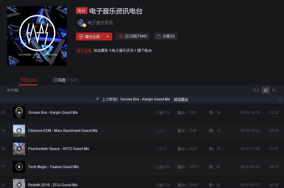 2018年4月,《电子音乐资讯》在网易云音乐上建立了《电子音乐资讯电台》,广泛向中国、国际DJ/制作人征收Continuous Mix投稿,采纳小部分优质的Continuous Mix于电台上独家发布,涉猎至少数十种电子音乐子类型。已发布20期电台节目,吸引7000多人关注。
