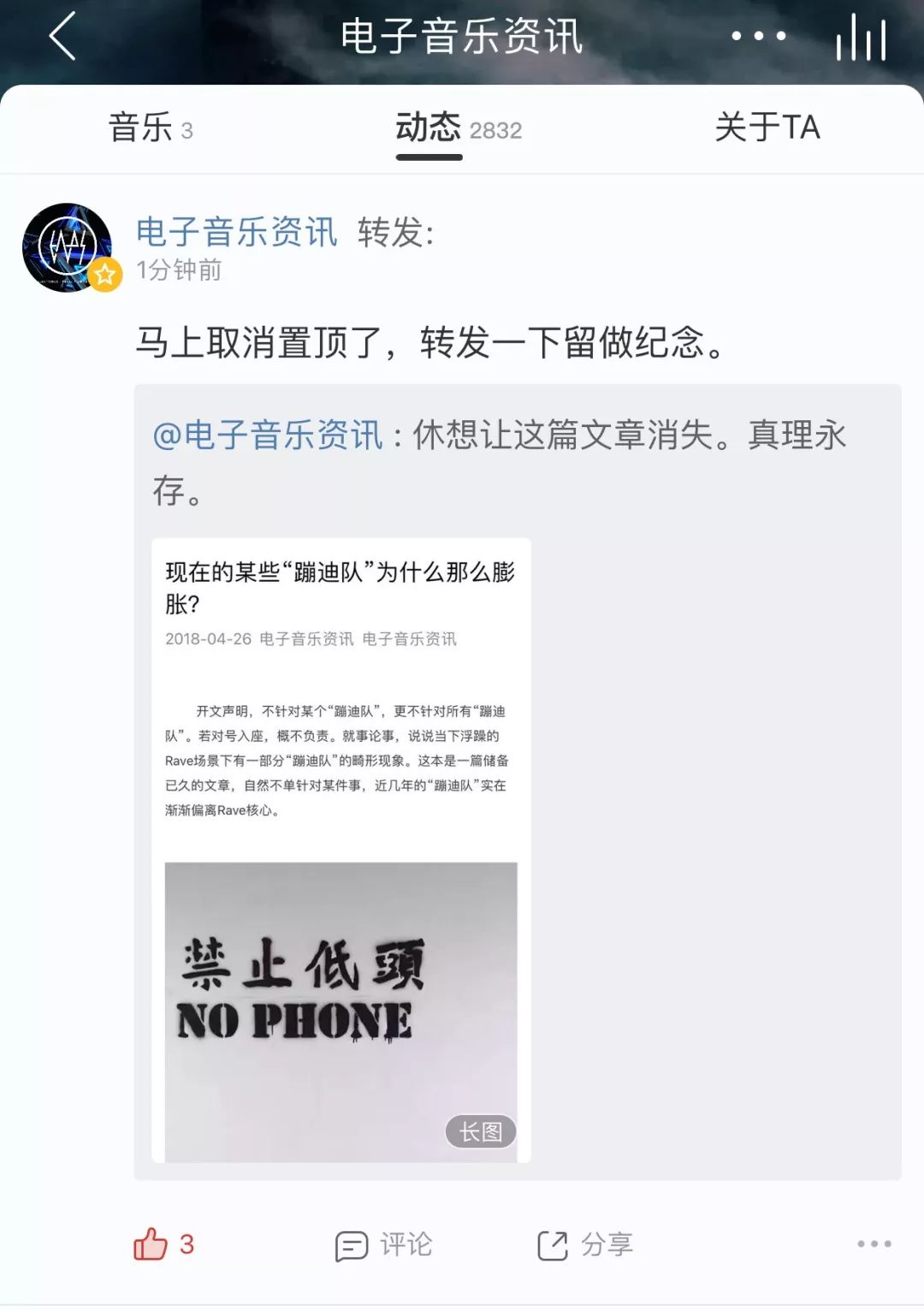 不过真相并没有死去,反倒在被修改重发后的文章、ElectronicNegative公众号、“电子音乐资讯”品牌的网易云音乐账号、“电子音乐资讯”品牌的微博被加以更大流量的传播。在事发后续的数月中,它成为了我们网易云音乐账号上的置顶内容。