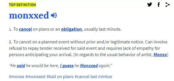 在西方国家的电子音乐领域,通俗来说,MONXXED就是“放鸽子”的意思。人们会将临时取消演出形容为MONXXED,也用来指责现在的MONXX简直就是一位“鸽子王”。于是MONXXED从鸽演出又被附上了鸽合作的“来头”。