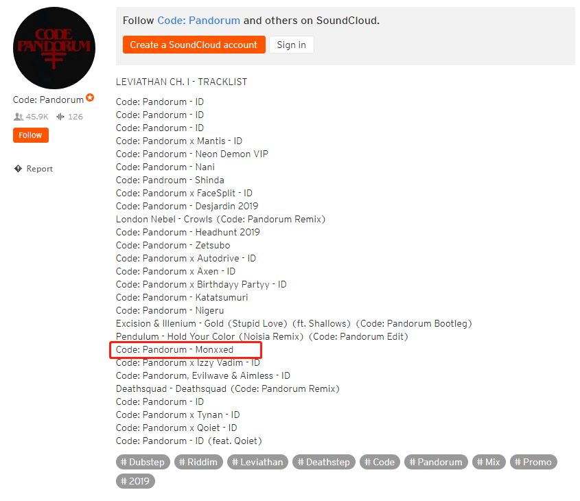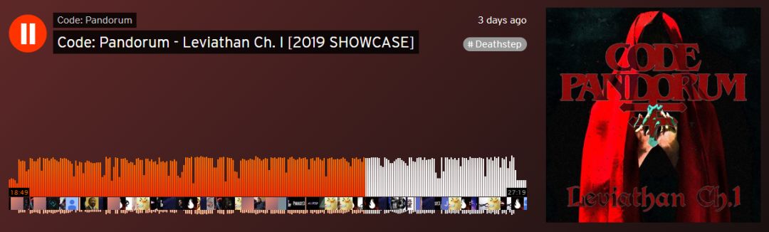 Code:Pandorum在近期发布了他的最新Continuous Mix“Code: Pandorum - Leviathan Ch. I”,长达30分钟,包括大量他将在2019年发布的ID。其曲风包括Deathstep/Orchestral Deathstep/Riddim Dubstep,可以在Soundcloud听到。