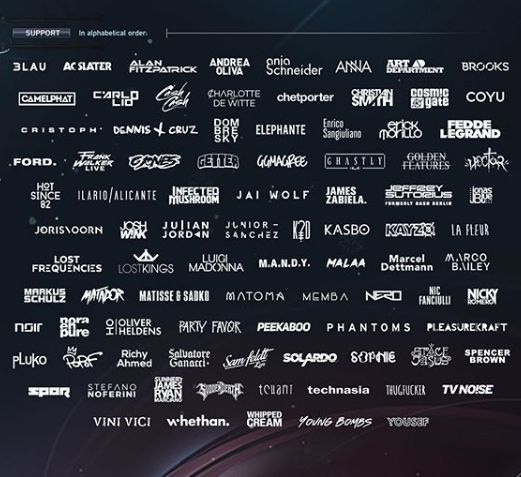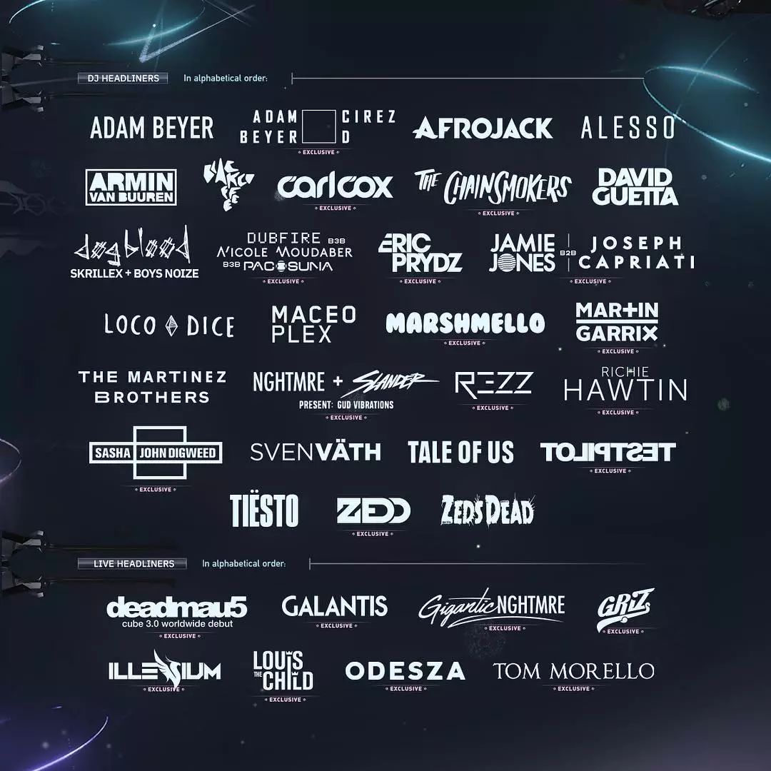 以EDM/Pop/Big Room House/EDM形式的其它曲风为主打方向的Headliners包括:Afrojack/Alesso/The Chainsmokers/David Guetta/Marshmello/Martin Garrix/Zeds Dead/Tiesto/Zedd/Zeds Dead/Galantis/ILLENIUM/Louis the Child