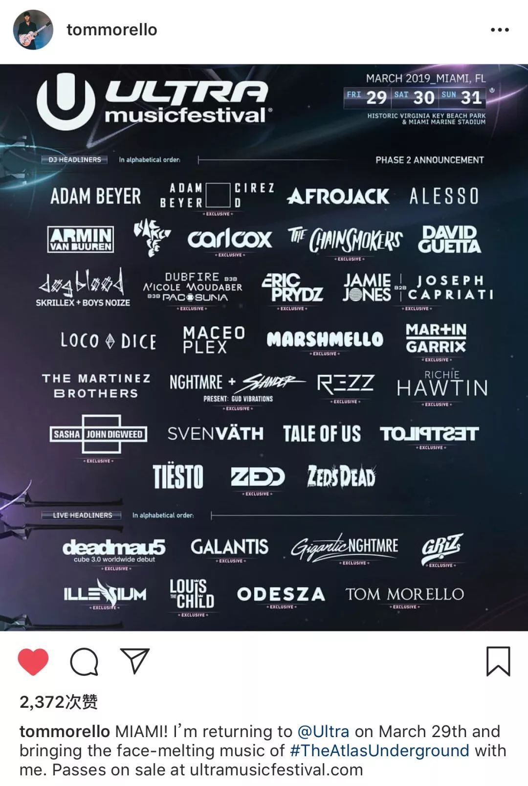 Tom Morello因《The Atlas Underground》而成为了Ultra Miami Headliner是一种猜测吗?当然不是!这已经是实锤了。Tom Morello在社交媒体上表达,他将在Ultra上,带来《The Atlas Underground》的表演,并形容为“Face-Melting Music”。