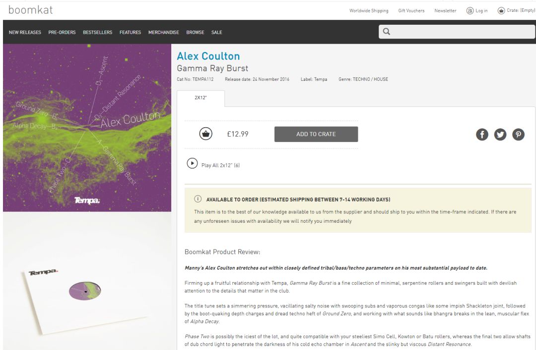 但可惜的是,Tempa Recordings自2016年11月24日,通过线上以及线下发布了Techno/House专辑《Alex Coulton - Gamma Ray Burst》以后,便没有再发布过任何音乐。2017年在Boomkat上线的专辑仅仅只是老唱片重新上架。