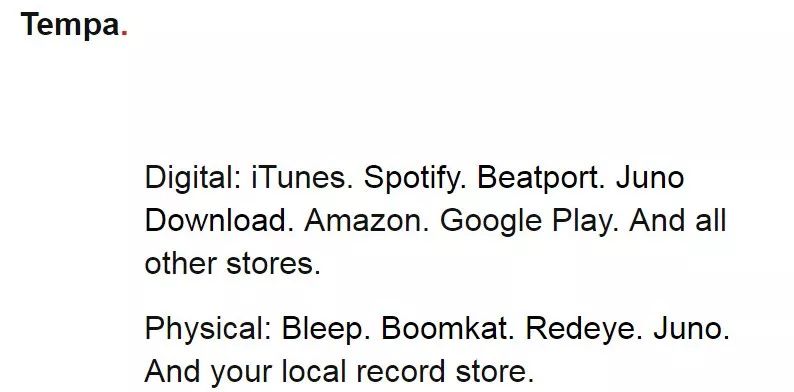 Tempa Recordings的数字唱片通常在iTunes/Spotify/Beatport/Juno Download/Amazon Music/Google Play进行官方渠道线上发布。而实体唱片,则在Bleep/Boomkat/Redeye/Juno以及线下官方实体店,对其厂牌作品进行售卖。