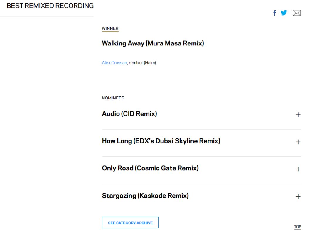 十分抱歉,关于昨日头条文章,我们在撰写文章时落下了一项同样与电子音乐有关的评定、奖项(第61届格莱美颁奖结果之电子音乐获奖作品评价)。最佳Remix录制奖,是一个面向电子音乐Remix作品的格莱美提名以及奖项,在每一年都会出现。