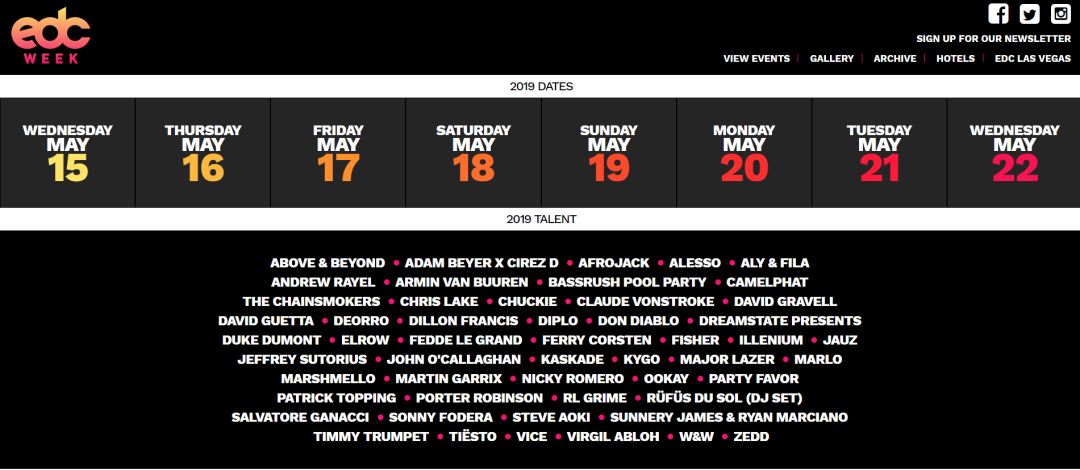 众所周知的国际一流音乐节之一EDC,全称Electric Daisy Carnival,前天于社交网络上宣布了相关Club Shows的完整阵容以及合作的拉斯维加斯地区的完整夜店。通过下方海报,读者们很容易得知这些形式的演出被叫作EDC Week。