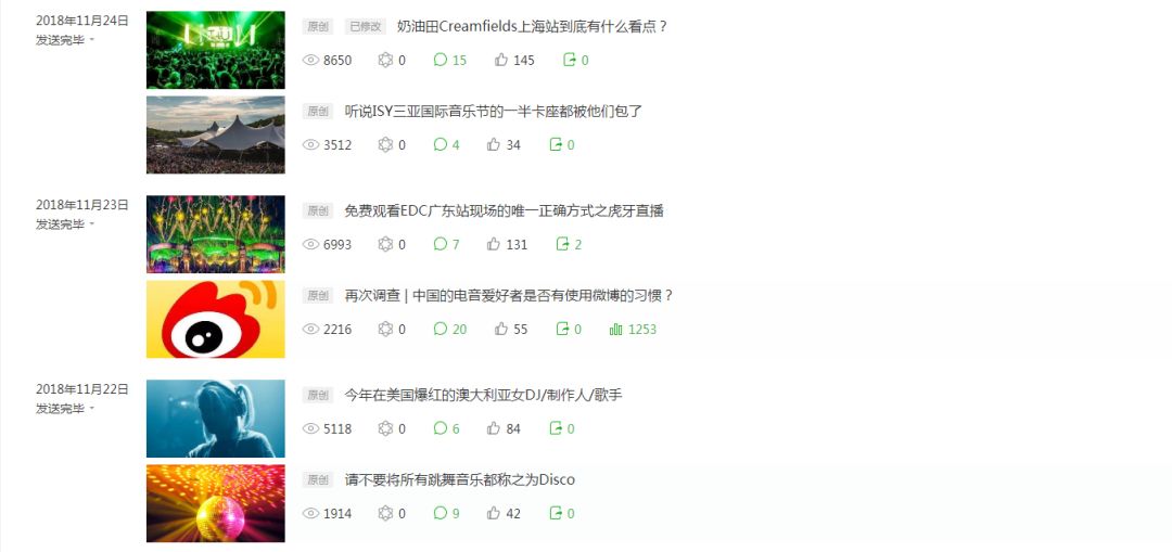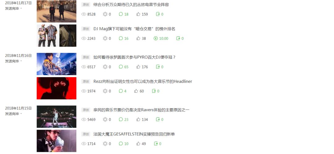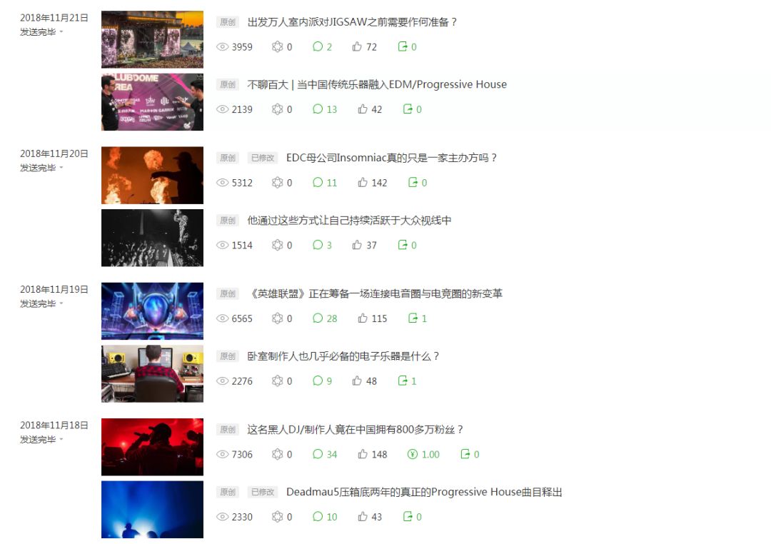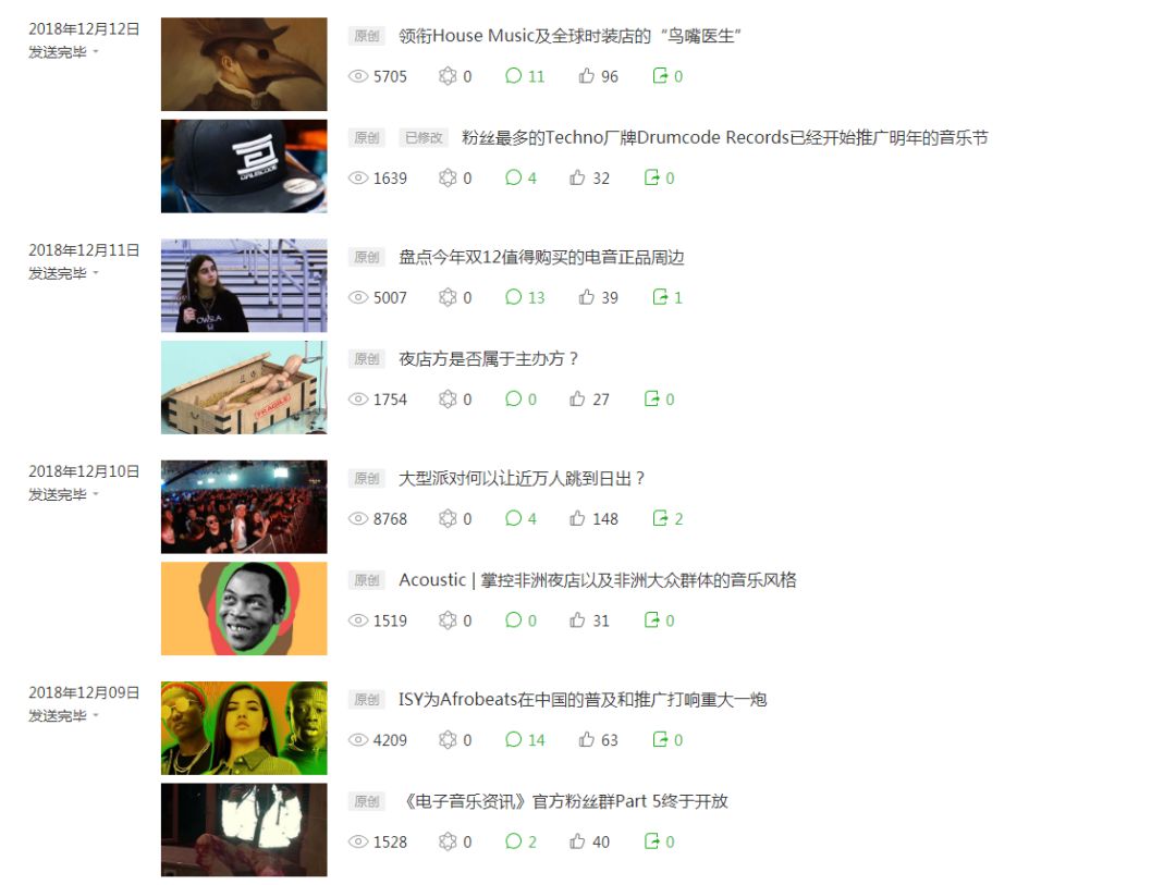 就事论事,根据以上抽查的点赞数据可得出,《电子音乐资讯》的文章点赞率大概在1%到3%这个范围内,属于非常合理的运营范畴。说个自嘲的事,子品牌《ElectronicNegative》文章点赞率通常在5%到15%,时常令我们的笔者们自叹不如。