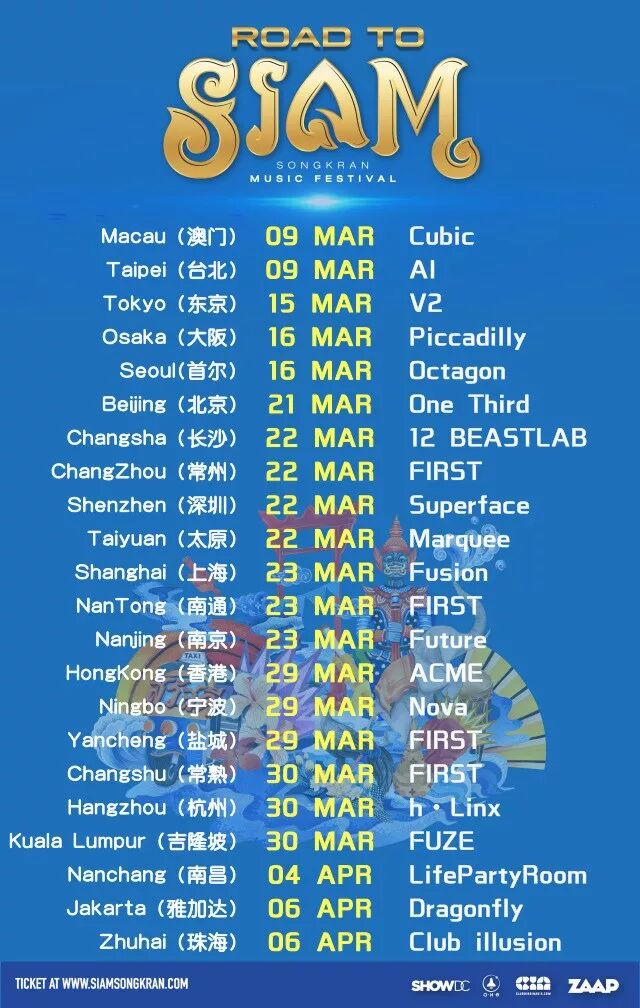 SIAM为夜店预热派对巡演计划创立了一个新的子品牌——Road To SIAM,同时出于推广泰国本土DJ/制作人的目的,他们派出了三组泰国具有影响力的DJ/制作人出演预热。这将可能是亚洲大型音乐节与夜店联动的一起新浪潮,让我们在现场相遇吧。