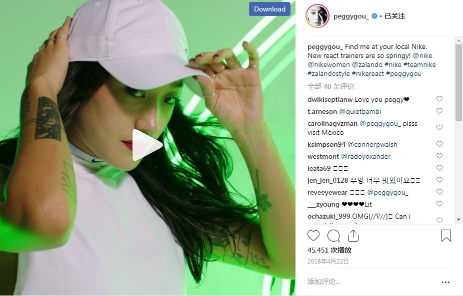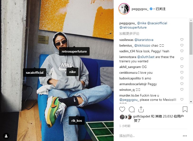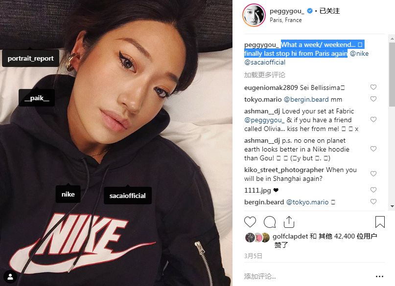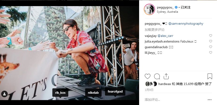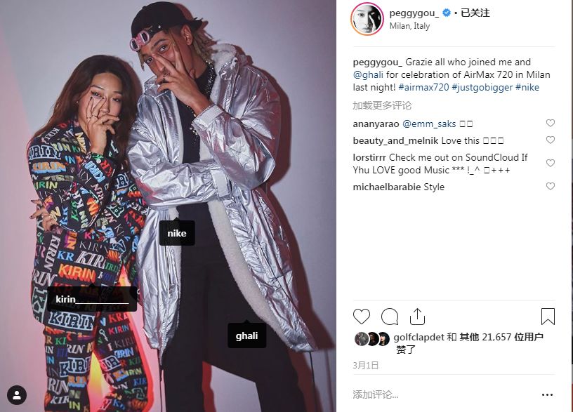 Peggy Gou与时尚品牌合作更不是首例。相比LV更明确的例子是Nike,即大家常说的“耐克”。Peggy Gou总是隔三差五地展示着Nike的商品,包括鞋类和服装,并且频繁地At Nike的官方账号。不懂的人以为她是狂热的粉丝,但没那么简单。