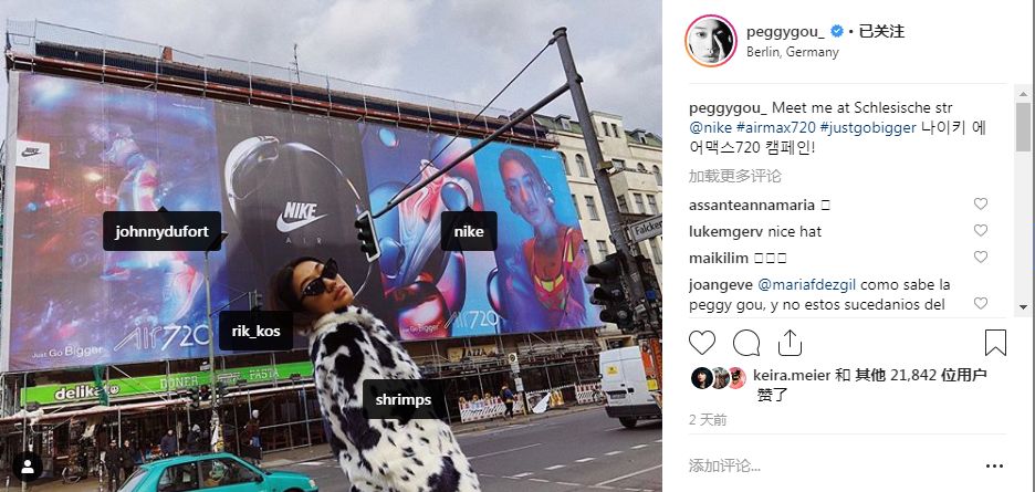 在许多地区,Peggy Gou甚至跟着Nike一起出现在了广告牌上。要知道,如果不存在广告代言的关系,Nike品牌方无权将Peggy Gou用于广告牌展示。至于其它时尚新媒体、时尚杂志的报道就不一一列举了,根本细化不完。