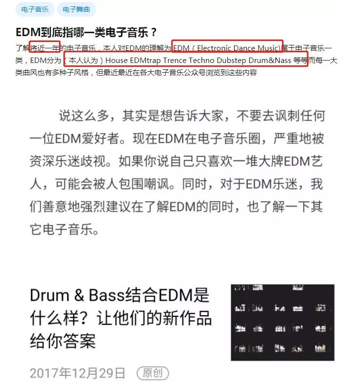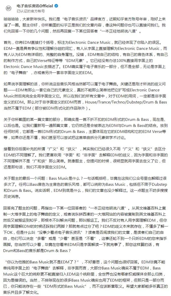 大约是在2018年1月,在问答平台“知乎”上出现了一则指向《电子音乐资讯》的一篇文章的疑惑或质疑,但提问者在第一时间已经表达了他的思想并引导回答者先入为主被灌输这一思想。他主观地认为EDM只是字面上的电子舞曲而已,所以它包含的范围甚广。