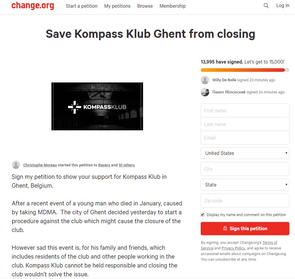 几天前,比利时根特市长Mathias De Clercq命令Kompass Klub关闭四个月,七月重新开门。三周以前,“Save Kompass”的情愿行动开始在社会公益请愿网站“Change.org”展开。目标1.5万人情愿,现在的请愿人数已经达到近1.4万人。