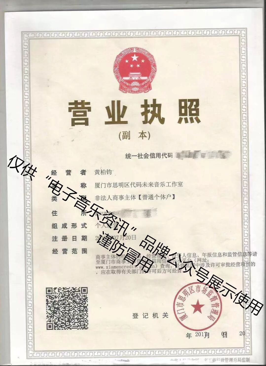 ⒈营业执照。《电子音乐资讯》团队在2017年注册了个体工商户,关键的原因在于品牌从个人发展至团队后有非常强的对公需求。比如说与合作方签署合约、与员工签署合约、与艺人签署合约、对公账户、开发票以及更多无需细数的工作方面。