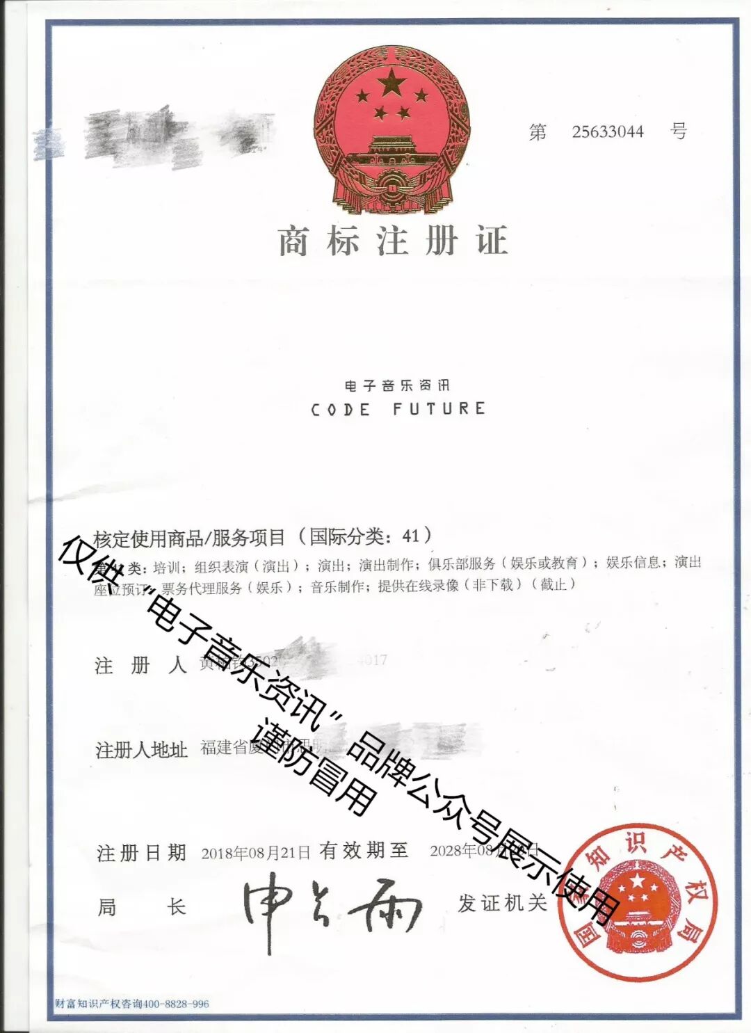 2017年,我方团队提交了“电子音乐资讯/Code Future”的中英文商标,及“电子音乐资讯”Logo的图形商标。后于2018年取得了“电子音乐资讯/Code Future”的商标注册证,可合法地保护中文名称“电子音乐资讯”与英文名称“Code Future”。