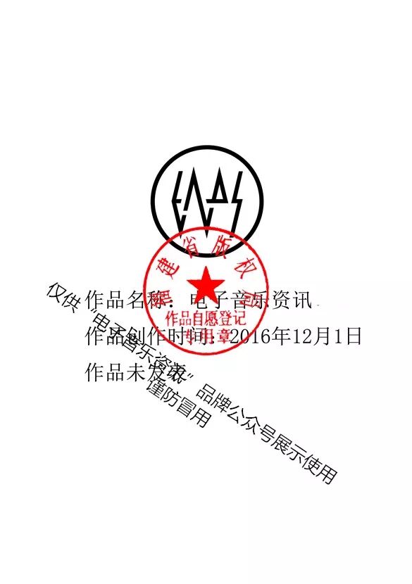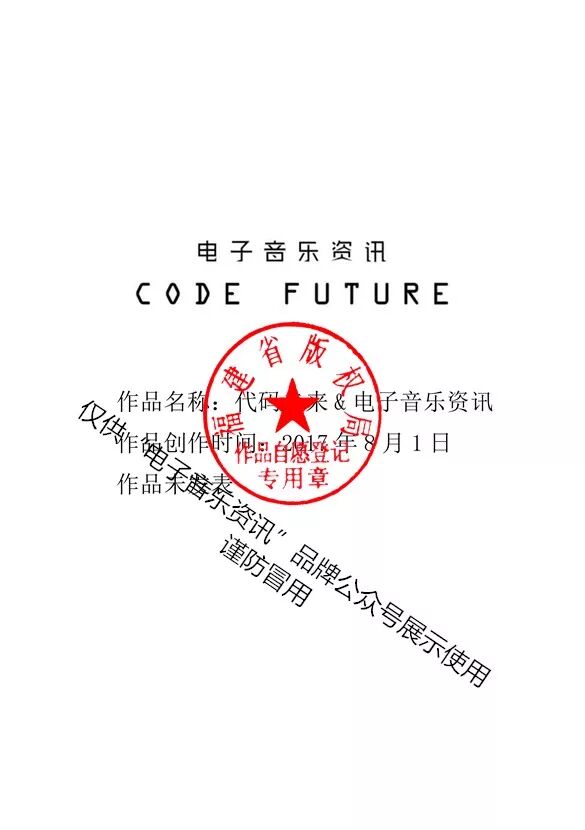 ⒊版权。大抵上与商标的性质同理,“电子音乐资讯/Code Future”的名字,以及“电子音乐资讯”Logo,均已注册版权。如果你使用了我们的名字或者商标,即使不侵犯商誉权,也侵权了版权。同样,所有子品牌均已注册版权,谨防双重侵权。