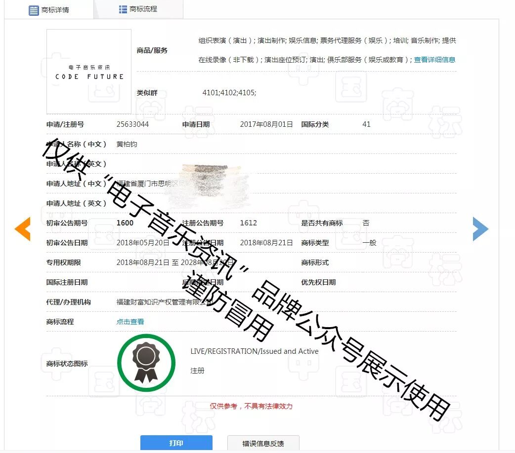 除了“电子音乐资讯/Code Future”以外,《电子音乐资讯》的所有相关项目,均以注册了商标,也就是说与《电子音乐资讯》相关的各种子品牌,我们都可以合法保护商誉权。且考虑到个体工商户早晚会因为种种原因升级为公司,我们留了一手。