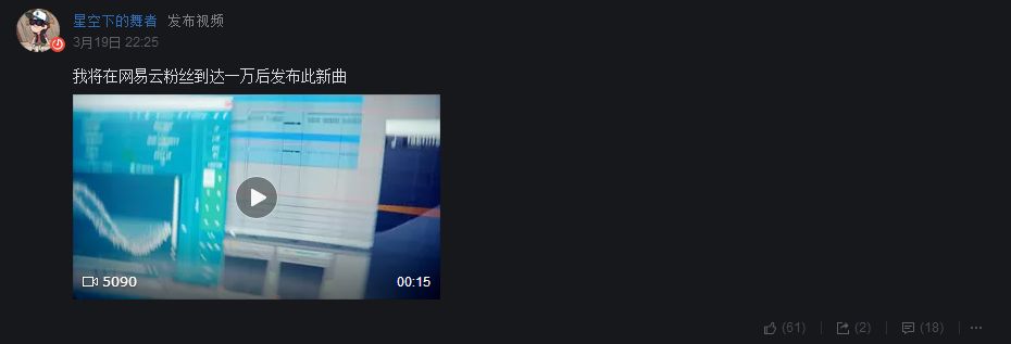 自复出消息一出,“星空下的舞者”获得了业内众多Dubstep乐迷的关注,从而开始可观地粉丝增长。2019年3月22日,中文艺名星空下的舞者,英文艺名DipperX的他,宣告在网易云音乐上的粉丝突破1万,并兑现了他发布新单曲《10K》的诺言。