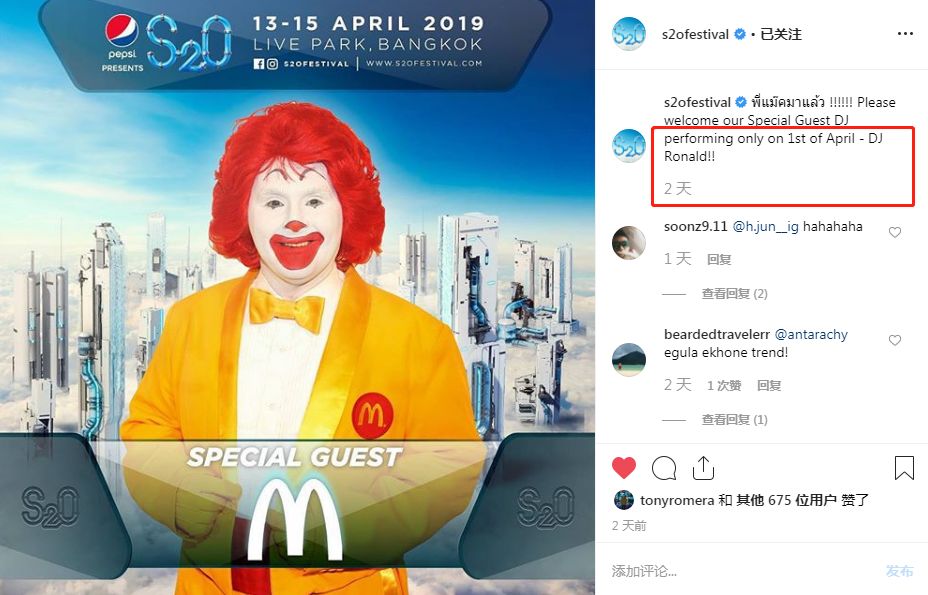但事实上,讽刺说起来还是太严肃了,尽管肯定不乏跟风意向。但我们很快确认了泰国音乐节在社交媒体上发布的内容。该泰国音乐节明确提到“仅在4月1日表演”。这几乎算是直接告诉粉丝,麦当劳创始人“诈尸当DJ”只是一起愚人节事件,有时效性。